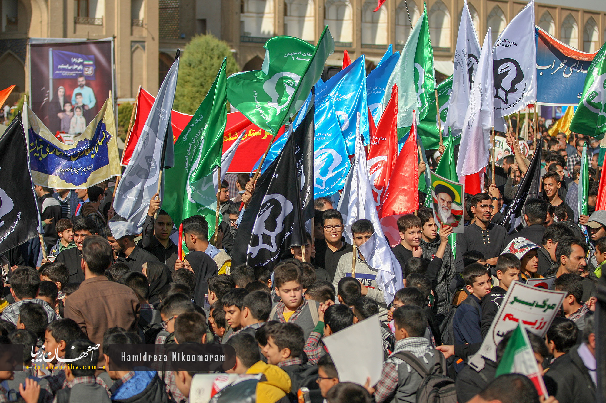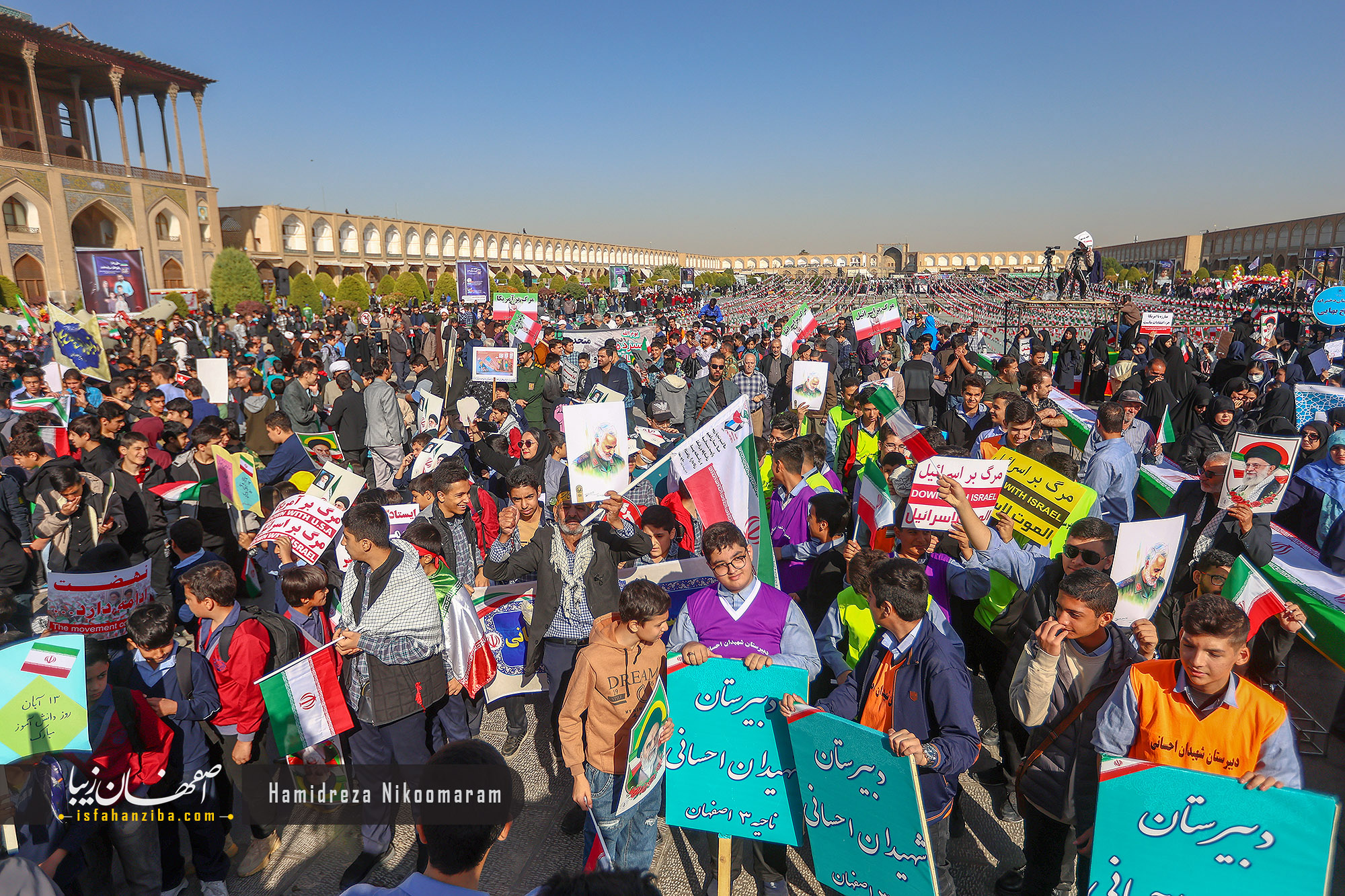 همزمان با روز ۱۳ آبان مردم شهیدپرور اصفهان در پاسخ به سیاستهای استکباری آمریکای جنایتکار و جریان استکبار در میدان امام خمینی(ره) تجمع کردند و شعار “مرگ بر آمریکا” و “مرگ بر اسرائیل” سر دادند.